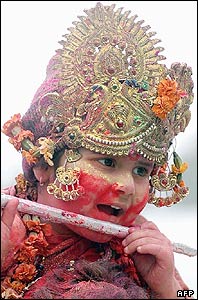 کودک هندو با آرايش ويژه و لباس سنتی برای مراسم فستيوال رنگ ها که فرارسيدن بهار در آن جشن گرفته می شود.