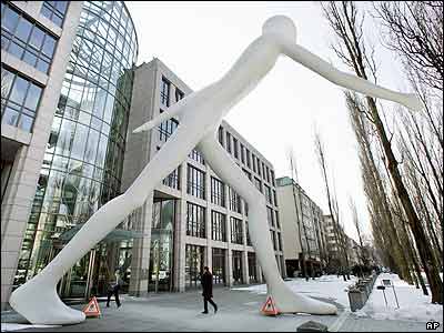 مجسمه بزرگ "راه رفتن مرد" ساخته جاناتان بوروفسکی، هنرمند آمريکايی، جلوی ساختمان مرکز بيمه Re AG در شهر مونيخ آلمان.