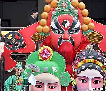 ماسک های سنتی اپرای معروف سيچوآن چين در مقابل يک مرکز خريد در شهر شنگدو در چين. گفته می شود که برنامه های اصلاحاتی درازمدت چين با مشکلات اقتصادی، سياسی و محيط زيستی روبرو است.