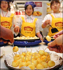 سيب زمينی های سرخ شده بلژيکی که در نمايشگاه بين المللی غذا و آشاميدنی در ژاپن برای امتحان مزه عرضه می شوند. |