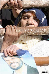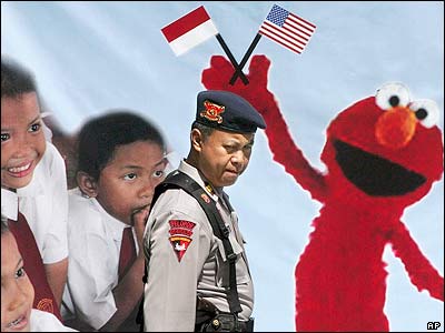 پليس اندونزی از جوخه "بمب" در حال نگهبانی جلوی پوستر آگهی برنامه تلويزيونی "سيزام"، يک سريال آمريکايی برای کودکان در جريان سفر کاندوليزا رايس، وزير خارجه آمريکا به اندونزی.