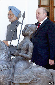 ميخاييل فرادکوف، نخست وزير روسيه و مانموهان سينگ، نخست وزير هند در جريان نشست هيات نمايندگان در خانه حيدر آباد در شهر دهلی نو هند.