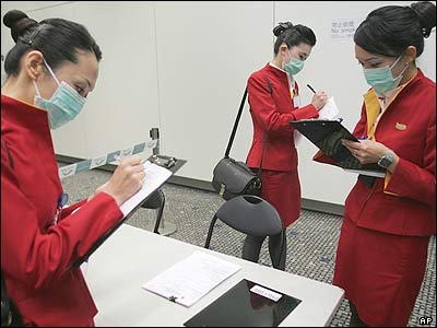 مهمانداران خط هواپيمايی "کتی پاسيفيک" هنگ کنگ در حال پر کردن فرم های مخصوص پزشکی مربوط به آنفلوانزای مرغی و ديگر بيماری های مسری.