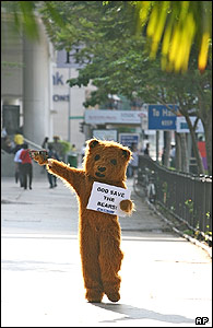 يکی از طرفداران حمايت از حيوانات در لباس به شکل خرس به يونيفرم های کارکنان قصر رييس جمهوری که در آن از پوست حيوانات استفاده می شود، در سنگاپور اعتراض می کند.