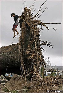 بازی کودک استرالیایی روی درختی که در اثر تند بادی موسوم به لاری ریشه کن شده است. این تندباد باعث ویرانی مزارع و چمن زارها در اينيسفيل، در شمال شرق استراليا، شده است. |