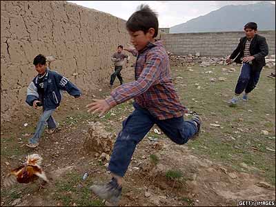 بچه های افغان در حال گرفتن یک مرغ در روستای دشت برچی در جنوب غرب کابل در جریان جمع آوری مرغها. یک مقام افغان می گوید پس از تایید شدن نوع 'اچ ۵ ان ۱' ويروس آنفولانزای مرغی در چندین مرغداری در سه استان افغانستان، دولت جمع آوری مرغها را آغاز کرده است