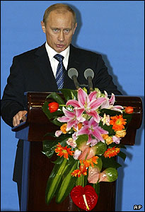 ولاديمير پوتين، ریس جمهورروسيه، در حال خواندن بیانیه ای در آغاز مذاکرات تجاری بین روسيه و چين در پکن
