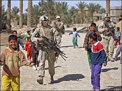 تفنگداران آمریکایی در حال گشت زنی در یک روستا در حومه شهر فلوجه، در غرب بغداد.