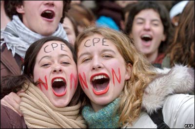 دو دختر دانشجوی فرانسوی در نانت، در اعتراض به قانون کار در مورد جوانان علامت 'نه' را روی صورت خود نقاشی کرده اند