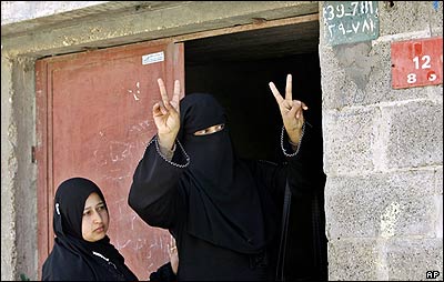 زنی از خويشاوندان يک بمبگذار انتحاری فلسطينی، در مراسم خاکسپاری او دستانش را به علامت پيروزی به حضار نشان می دهد.