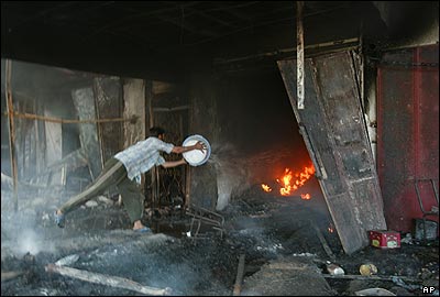 مرد عراقی در حال خاموش کردن مغازه اش در بغداد، که بعد از يک بمب گذاری خيابانی دچار حريق شده است.