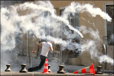 يکی از شرکت کنندگان در تظاهرات عليه قانون جديد کار در فرانسه در حال پناه گرفتن از گاز اشک آوری است که پليس به طرف معترضين پرتاب کرده است.