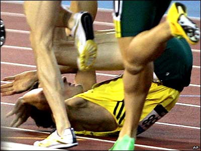 کریگ موترام دونده استرالیایی که در دور نهایی رقابت ۱۵۰۰ متر مردان در مسابقات دو و میدانی ملبورن به زمين خورد.