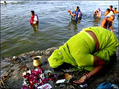 عبادت یک زن هندو و غسل در رودخانه ای در الله آباد هند.