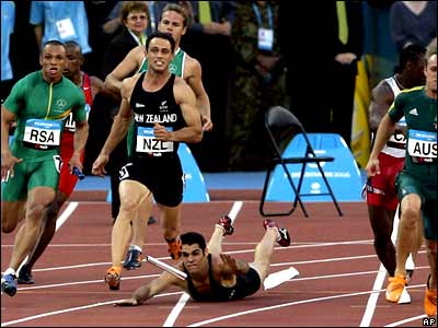 آخرین تلاشهای جیمز دالفین، دونده نيوزلندی برای رساندن چوب مسابقه به هم تيمی اش بی نتیجه ماند. |