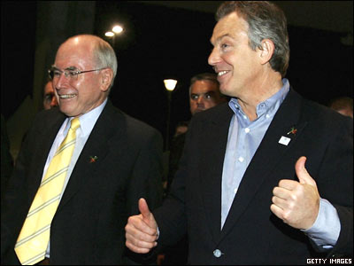 جان هوارد نخست وزیر استرالیا در روز دهم از بازیهای کشورهای مشترک المنافع به تونی بلر خوش آمد میگوید.