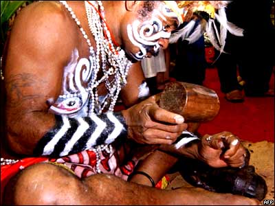 یک مرد مجسمه ساز در حال کار در نمایشگاهی در جاکارتا.