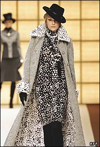 مانکنی يکی از مدل های لباس از کلکسيون پاييز و زمستان ۲۰۰۶ يون آشيدا، طراح لباس ژاپنی را در هفته مد ژاپن به تماشا می گذارد.