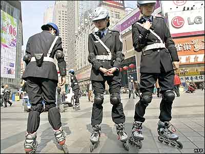 سه پليس چينی با اسکيت در خيابان های شهر شانگکينگ، جنوب غربی چين، در حال گشت و گذار هستند. گزارش ها حاکی است که در سال 2005، تعداد زندانيان چين ده درصد افزايش داشته و به 844 هزار و 717 تن رسيده ا ست.