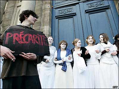 دانشجويان فرانسوی با لباس های سفيد رنگ در مقابل ساختمان شهرداری شهر بوردو در جريان اعتصابات سراسری فرانسه به سياست های جديد استخدامی اعتراض می کنند.