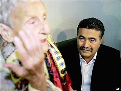 امير پرز، رهبر حزب کارگر اسرائيل در کنار يکی از طرفدارانش منتظر انداختن رای خود به صندوق است.