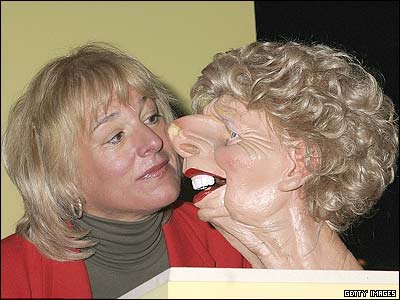 کرول تاچر، دختر مارگارت تاچر، نخست وزير پيشين بريتانيا، در کنار مجسمه ای شبيه مادرش. اين اثر به همراه ديگر کارهای هنری در نمايشگاه جديد با عنوان "لندن طنزآميز" در موزه لندن برای بازديد عموم به نمايش گذاشته شده است.