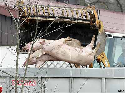خوک های کشته شده را داخل سطل بزرگ زباله دانی در يکی از شهر های آلمان می ريزند. در اثر شيوع يک نوع بيماری حيوانی به نام "تب خوک" ۱۵۰۰ خوک را به دليل جلوگيری از گسترش اين بيماری در کشتارگاه کشته اند.