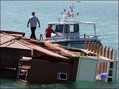 نيروهای امداد لاشه کشتی تفريحی را که در آب های ساحلی بحرين در خليج فارس غرق شده، به ساحل منتقل می کنند. مقام ها و شاهدان عينی می گويند که بيش از ۶۰ نفر از ۱۵۰ مسافر کشتی تاکنون از دريا نجات داده شده اند.