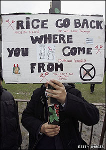 تجمع گروهی از دانش آموزان دبيرستان پليکگيت شهر بلک برن انگلستان بهمراه والدينشان در اعتراض به ديدار کاندوليزا رايس، وزير امور خارجه آمريکا از اين مدرسه. اين ديداربه دعوت جک استرا، همتای بريتانيايی او صورت گرفته است.