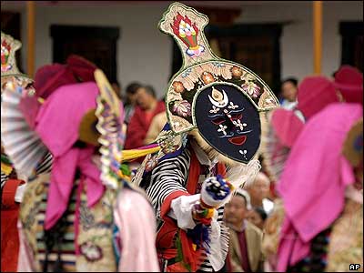 به مناسبت جشنواره نه روزه ماست در شهر دارامسلا هند، گروهی از هنرمندان انجمن هنرهای نمايشی تبت، نمايش های سنتی را با ماسک های مخصوص اجرا می کنند.