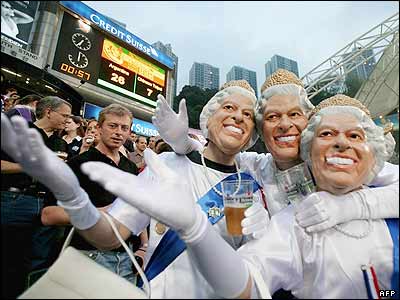 چند نفر از طرفداران بازی راگبی که خود را به شکل اليزابت ملکه بريتانيا درآورده اند، شروع دوره بازی های راگبی در هنگ کنگ را جشن می گيرند.