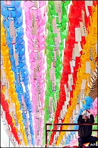 يک بودايی اهل کره جنوبی در حال تزيين يک معبد با فانوس های رنگی به مناسبت نزديکی زادروز بودا در شهر سئول.
