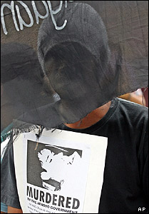 دانشجوی معترضی که پارچه سياه يک پلاکارد صورتش را پوشانده در تظاهراتی در مانيل، اعلاميه قتل يک فعال دانشجويی را در دست گرفته است. دانشجويان معترض، دولت را مسئول قتل کريس هوگو می دانند که اخيرا بدست مردان مسلح ناشناس در شمال شرقی فيليپين کشته شد.