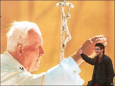 يک توريست در شهر ورشو، پايتخت لهستان جلوی پوستر پاپ ژان پل دوم برای عکس گرفتن ايستاده است. در آستانه سالگرد درگذشت پاپ ژان دوم، شهروندان لهستانی خود را برای مراسم ملی به همين مناسبت آماده می کنند. |