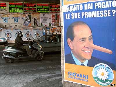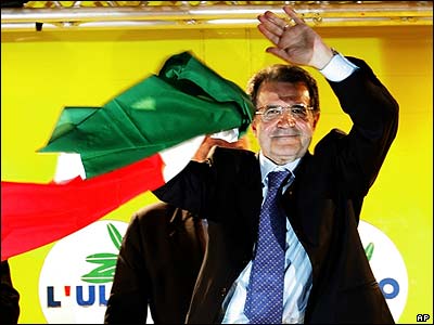 رومانو پرودی رهبر چپ ميانه ايتاليا پيروزی خود را بر رقيب راستگرای خود سيلويو برلوسکونی جشن می گيرد.