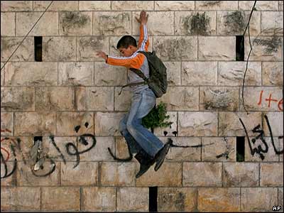 يک پسر فلسطينی در حال پرش جلوی ديواری در غرب شهر نابلوس. سربازان اسرائيلی امروز برای بازداشت چند فلسطينی در اين قسمت از شهر به تيراندازی پرداختند.