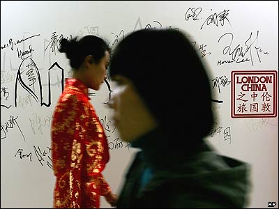 دو رهگذر چينی کنار پوستری برای برگزاری يک سمينار مشترک چينی و انگليسی در مورد تبادل نظر در طرح آگهی های تجارتی بين اين دو کشور که در شهر پکن برگزار شده است.