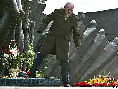 شصت و يکمين سالگرد آزادی زندانيان اردوگاه کشتار يهوديان: يکی از بازماندگان اردوگاه آشويتس پس از ادای احترام در کنار بنای يادبود برای قربانيان جنگ جهانی دوم در شهر مسکو.