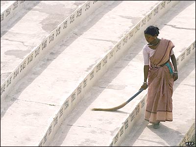يک زن هندی در حال جارو کردن پله های استاديوم ورزشی در شهر جمشيدپور هند يک روز قبل از شروع بازی های بين المللی کريکت بين هند و بريتانيا.