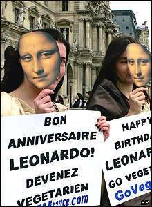 گرد هم آيی فعالان حمايت از حقوق حيوانات در مقابل موزه لور پاريس برای بزرگداشت تولد لئوناردو داوينچی. آنها عقيده دارند که اين هنرمند ايتاليايی گياه خوار بوده است.