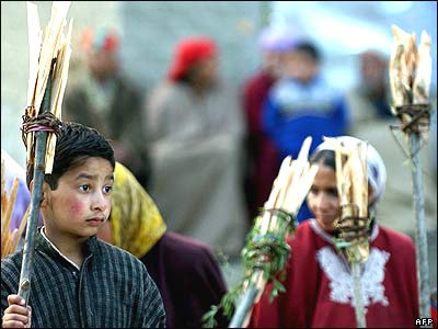 کودکان کشميری در فستيوال "نور". در اين فستيوال که همه ساله در پايان زمستان و اول بهار برگزار می شود، آمدن نور و روشنايی جشن گرفته می شود.