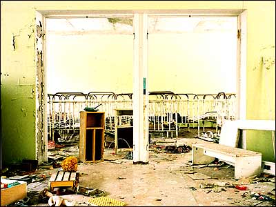 در اين مهد کودک ماسک های ضد گازبه چشم می خورد. عکاسان برای بهتر شدن عکس هايشان آنها را همه در سراسر ساختمان پراکنده کرده اند.