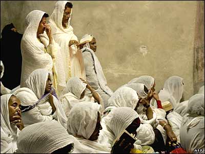 گروهی از مسيحيان ارتودوکس اهل اتيوپی در حال عبادت در کليسای قديمی "قيامت" در شهر بيت المقدس. مسيحيان معتقدند پيکر عيسی مسيح پس از به صليب کشيده شدن در اين کليسا دفن شده است.