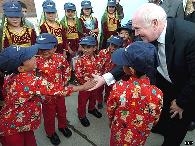 جان ريد، وزير دفاع بريتانيا در هنگام ديدار از يک پرورشگاه در کابل. وی برای ديدار با حامد کرزی، رييس جمهور و وزيران بلندپايه افغانستان وارد پايتخت اين کشور شده است.