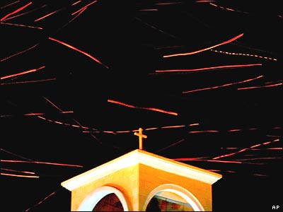 بارقه های آتش برپا شده در مراسم عيد پاک مسيحان ارتدوکس بر فراز کليسايی در بلگراد