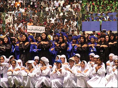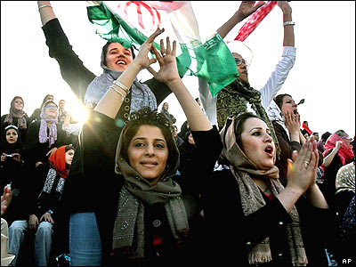 شور و شعف تماشاچيان ايرانی در پايان مسابقه تيمهای فوتبال زنان ايران و آلمان. اين مسابقه با نتيجه دو بر دو به تساوی رسيد.