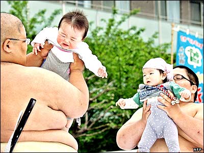 دو کشتی گير ژاپنی در جريان مسابقه سالانه گريه کودکان بچه هايی را در آغوش گرفته اند. ژاپنی معتقدند که کشتی گيران سبک سومو می توانند به سلامتی کودکان کمک کنند.