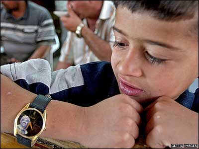 پسر بچه عراقی به ساعت خود نگاه می کند که به عکس صدام حسین، رييس جمهور برکنار شده ای این کشور مزین شده است. در جلسه دادگاه رسيدگی به پرونده صدام حسين، رهبر سابق عراق، در ارتباط با کشتار شيعيان دجيل در سال 1982، وی از پاسخگويی به اتهامات مطرح شده توسط دادگاه خودداری ورزيده است.