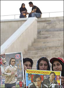 دختران ايرانی با پوسترهای علی کريمی و فريدون زندی، اعضای تيم ملی فوتبال ايران. تيم ملی ايران در دور مقدماتی مسابقات جام جهانی فوتبال با تيمهای مکزيک، پرتغال و آنگولا هم گروه است.