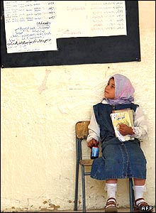 دختربچه عراقی در مدرسه ای در منطقه فقيرنشين صدر در بغداد در انتظار گذراندن امتحان. ميليونها نفر از دانش آموزان عراقی امروز برای شرکت در نخستين امتحانات نهايی خود به مدرسه رفتند.